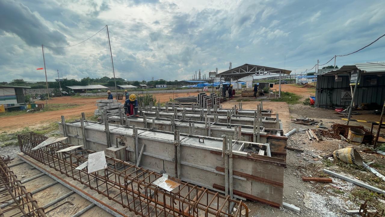 Pengecoran precast beam piperack D 4 unit, fabrikasi embedded piperack H dan embedded sleeper dike wall concrete |