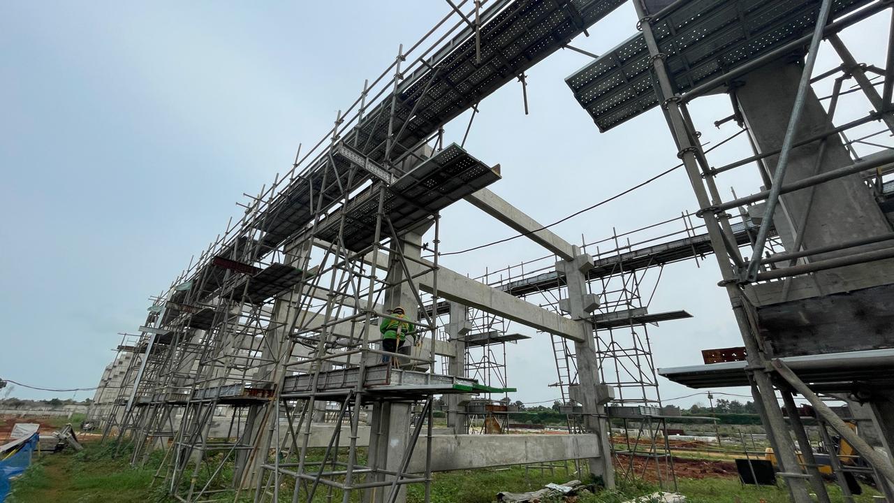 Pembesian kolom dan beam, pemasangan ringlock. Pembesian beam precast |