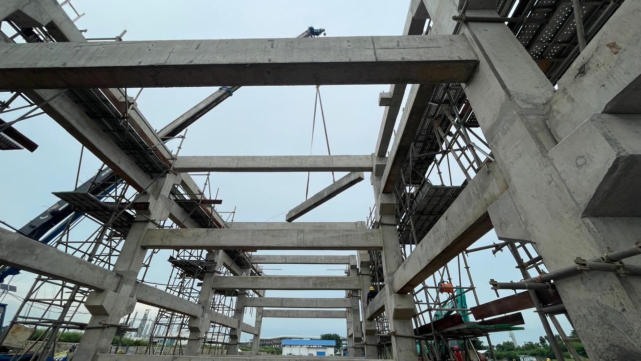 Pembesian kolom dan beam, pemasangan ringlock. Pembesian beam precast |