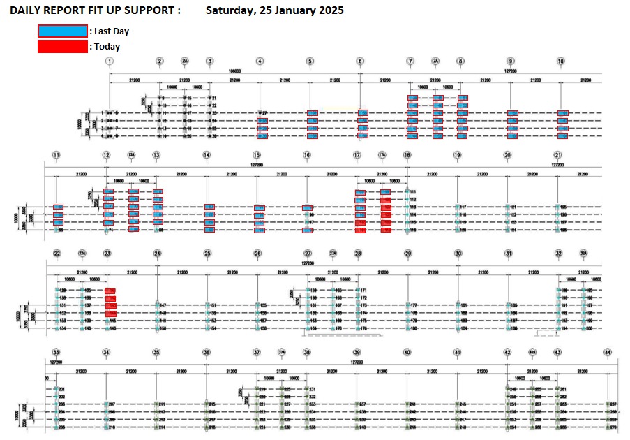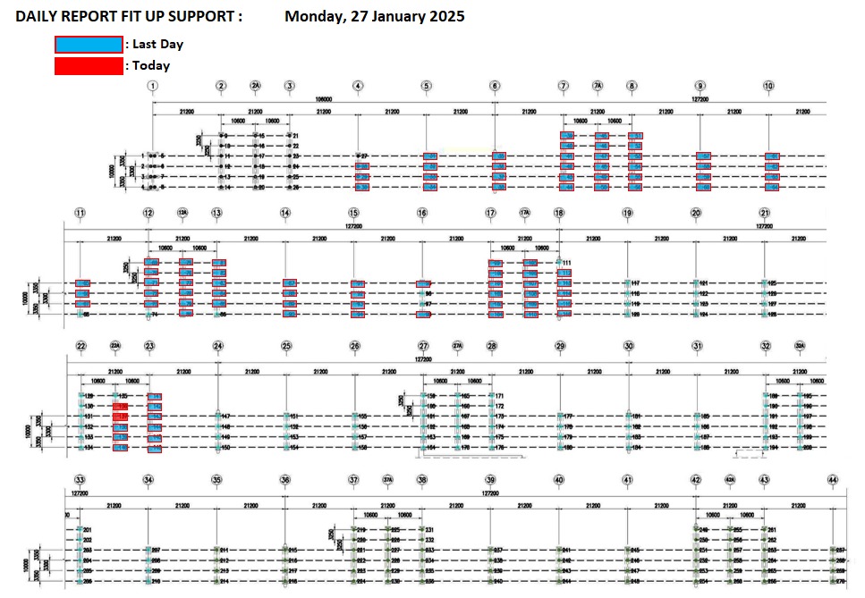 Pemasangan support pilecap grid 15 : P91, P92, P93, P94. Grid 16 : P95, P98. Grid 17 ; P99, P100, P101, P102. Grid 17A ; P105 |